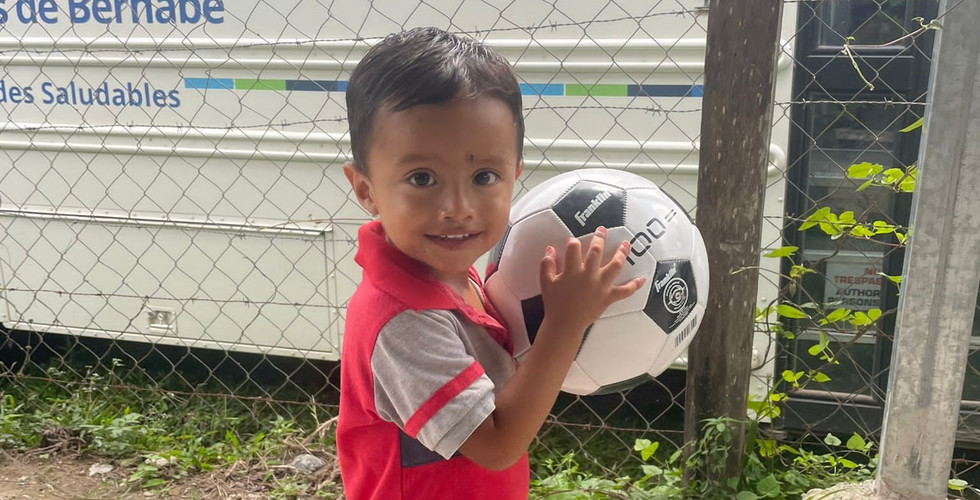 After the children went to the weights and measures station, they lined up to enter the medical, dental, or vision clinic. While they waited, many of them played. One little girl with a polka dotted dress was just learning to walk. She could stand up by herself but would then sit back down and crawl to her mother or the nearby steps so that she could hold on and cruise. A little boy who was also about one-year-old kept crawling up the steps. His mother would pick him up and try to send him in the direction opposite from the steps, but he kept turning back to the steps and going up. This happened repeatedly. Another little boy, probably six months older but much steadier on his feet followed him. The two boys had a great time laughing and playing together. The older children played on the playground and kicked around a soccer ball. Somehow by the end of the day, a very little boy, maybe one-and-a-half years old, ended up with the ball. He walked up to us with the biggest, proudest grin on his face.